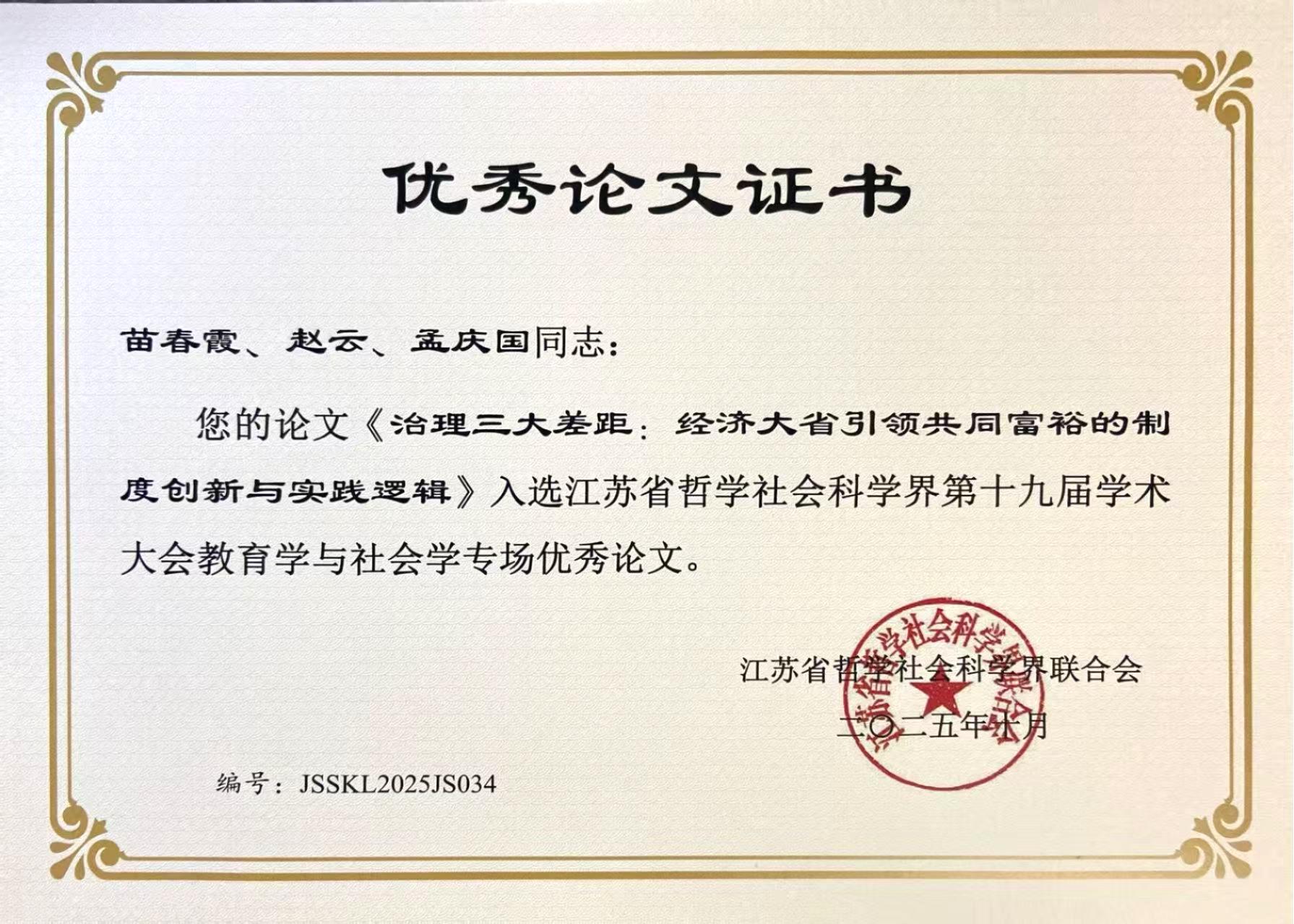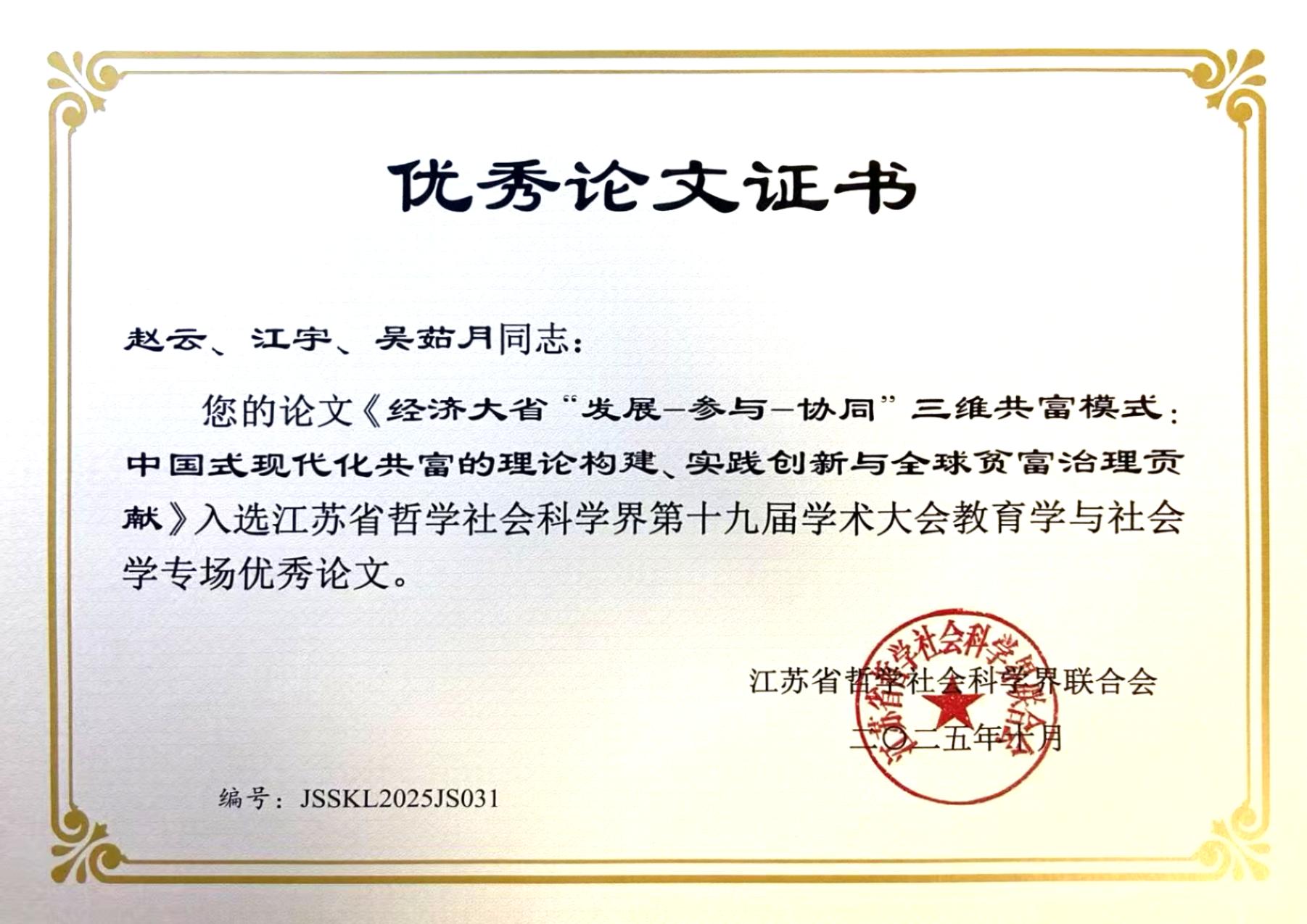 10月24日,由中共江苏省委宣传部、江苏省哲学社会科学界联合会主办,江苏师范大学承办的江苏省社科界第十九届学术大会教育学与社会学专场在徐州举行。来自教育学与社会学领域的专家学者热议党的二十届四中全会精神,围绕“促进全体人民共同富裕”主题深入探讨探索“构建高质量教育体系”“完善共建共治共享的社会治理制度”“促进人的全面发展”的路径。管理学院苗春霞教授科研团队的参会论文《治理三大差距:经济大省引领共同富裕的制度创新与实践逻辑》、赵云教授科研团队的参会论文《经济大省“发展-参与-协同”三维共富模式:中国式现代化共富的理论构建、实践创新与全球贫富治理贡献》均荣获优秀论文奖。