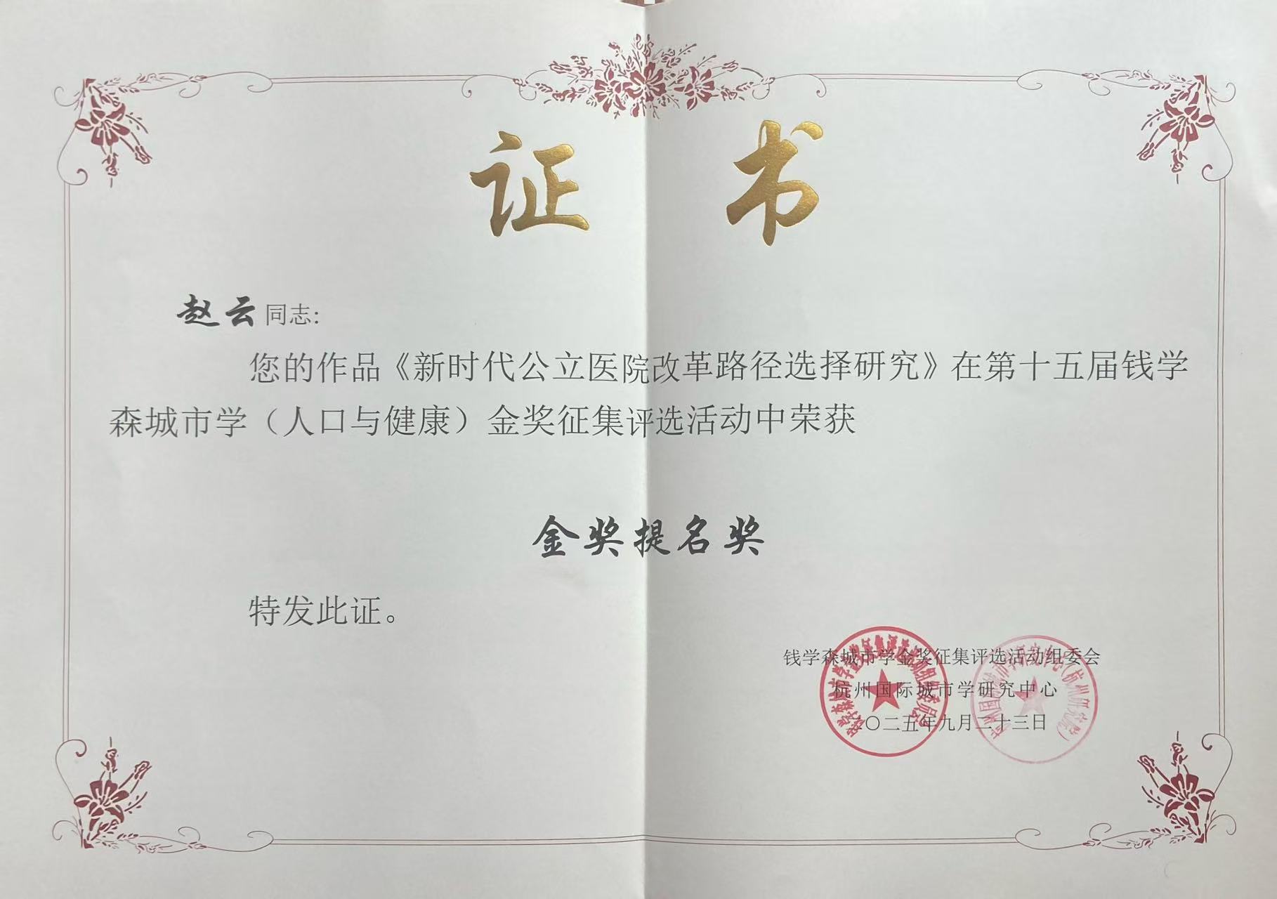 近日,第十五届钱学森城市学金奖评选结果揭晓。管理学院赵云教授科研成果《新时代公立医院改革路径选择研究》荣获钱学森城市学(人口与健康)金奖提名奖。