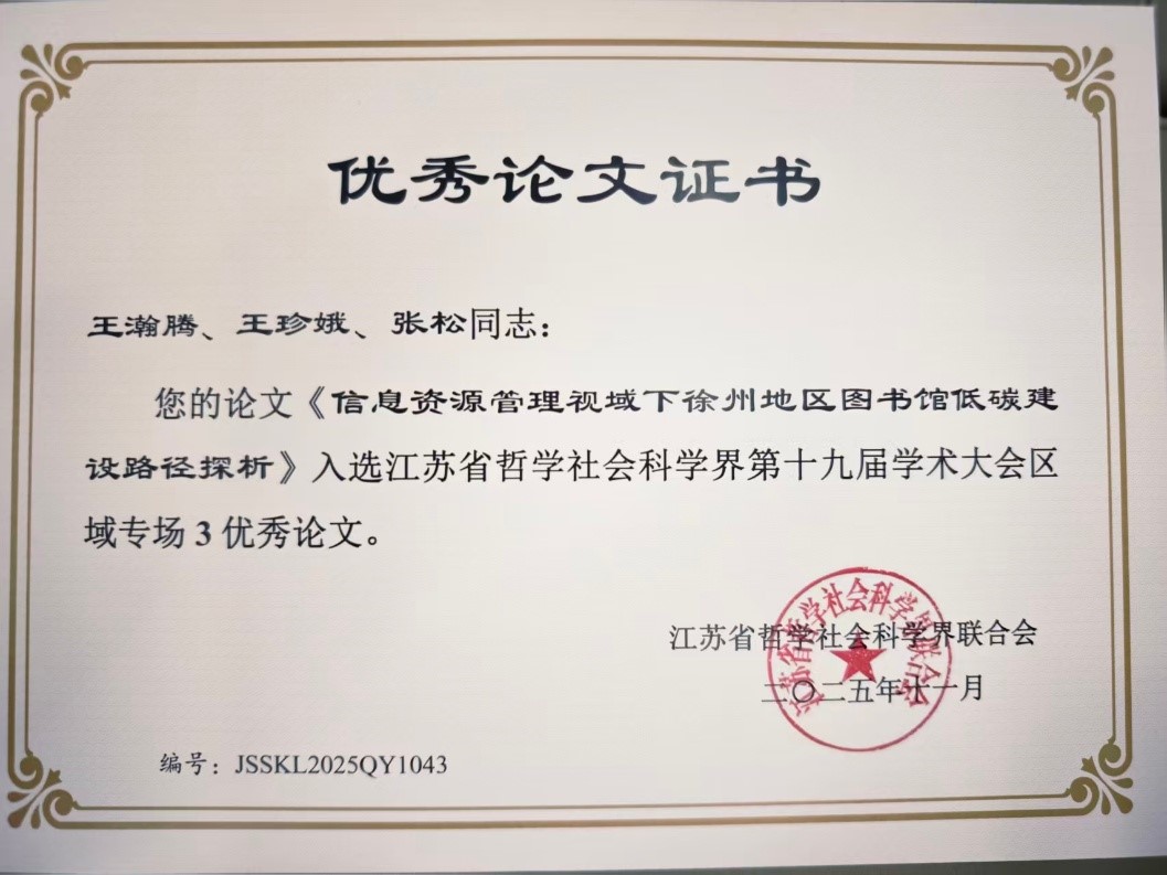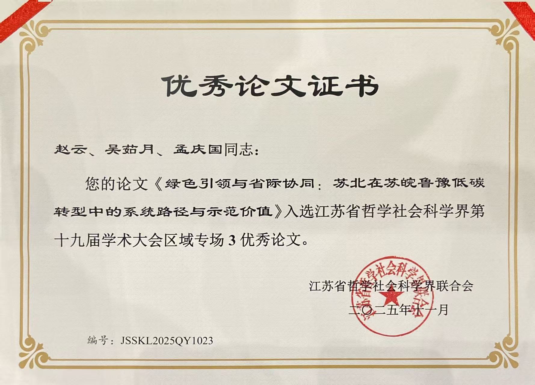 11月17日,由中共江苏省委宣传部、江苏省哲学社会科学界联合会主办,盐城师范学院承办的江苏省社科界第十九届学术大会区域专场3在盐城举行。来自苏北四市的专家学者热议党的二十届四中全会精神,围绕“聚焦绿色低碳”主题深入探讨探索“拓展发展新空间”的路径。管理学院赵云教授科研团队的参会论文《绿色引领与省际协同:苏北在苏皖鲁豫低碳转型中的系统路径与示范价值》,张松副教授科研团队的参会论文《信息资源管理视域下徐州地区图书馆低碳建设路径探析》均荣获优秀论文奖。