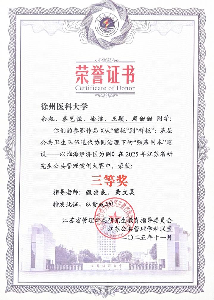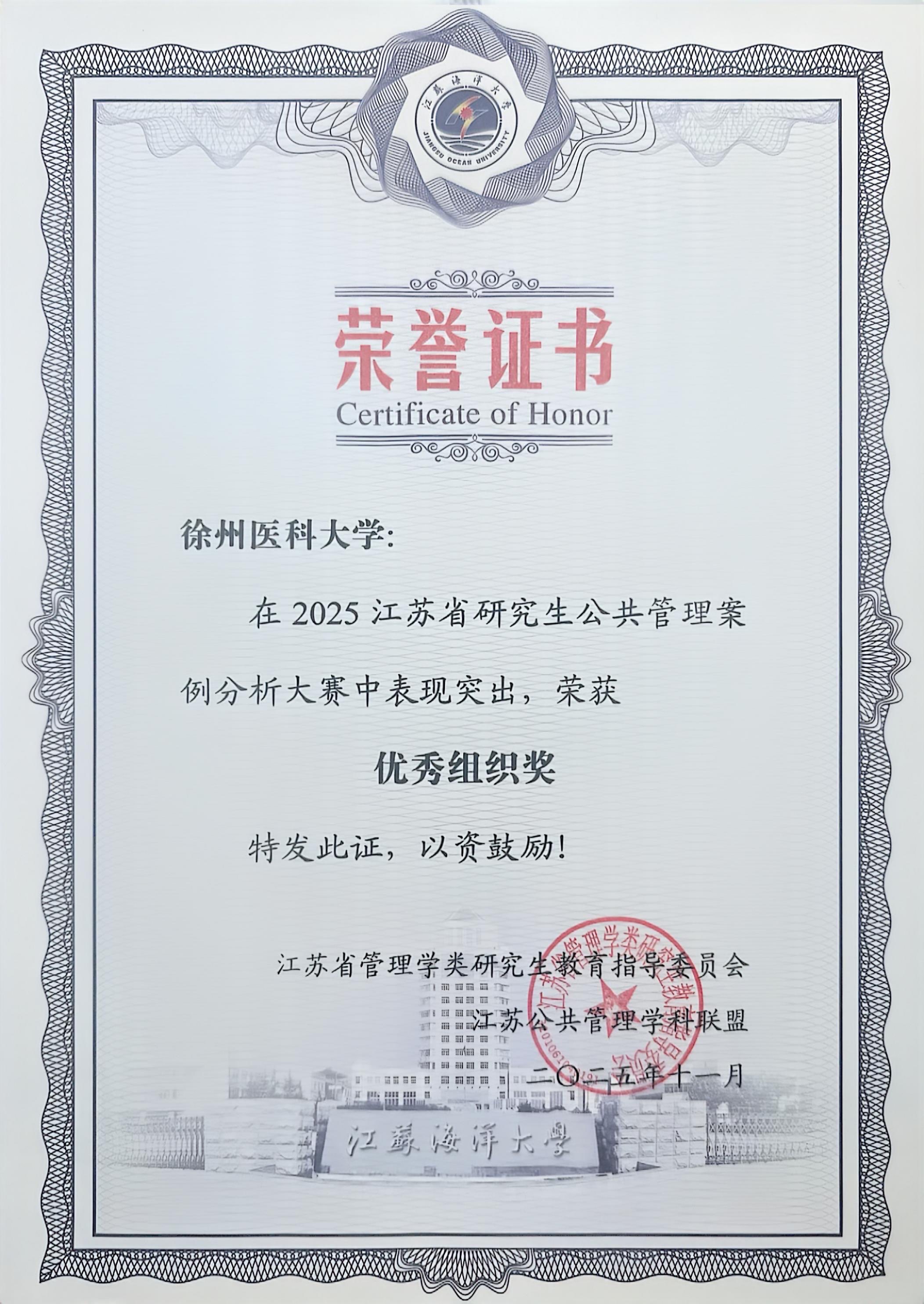 在学院领导的高度重视以及老师们的全力动员与悉心指导下,我校荷你有约队(团队成员:张瀚文、向玉、刘纯纯、余敏、陈瑞昂,指导老师:黄心如、温宗良)与基卫之星队(团队成员:余旭、秦艺恒、徐洁、王颖、周甜甜,指导老师:温宗良、黄文昊)荣获大赛三等奖,徐州医科大学获“优秀组织奖”!