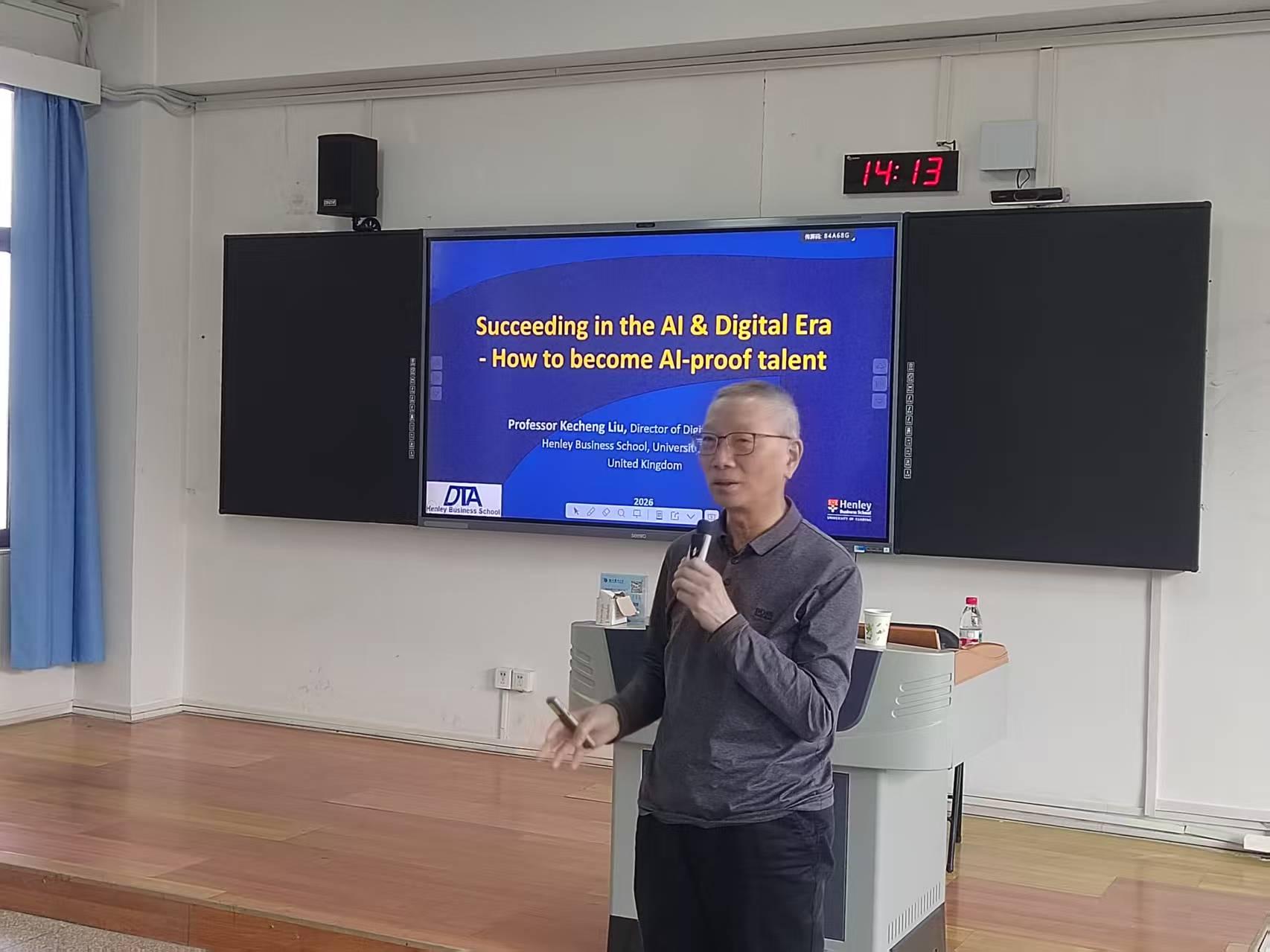 刘科成教授被公认为组织符号学与商业信息学领域的全球学术领袖。本次讲座刘教授以“Succeeding in the AI & Digital Era---How to become AI-proof talent”为题,首先回顾了历次工业革命的演变,并结合具体案例剖析数字技术与平台经济如何重塑现代商业生态。面对当前各类主流生成式人工智能工具的发展,刘教授从哲学、认知科学与符号学的多重维度,解读人工智能与人类智能的本质区别。他指出AI的核心运作依赖于数据映射与模式重组,而人类的独特性与壁垒在于真实的“具身性”体验、复杂情感共鸣以及三元意义建构能力。他以此为基础,详细拆解了不被机器取代的“AI-Proof”职业特征,并强调了批判性思维、深层同理心、创造力与数字伦理判断等核心素养在未来职场中的重要性,为师生们指明自我提升的方向。